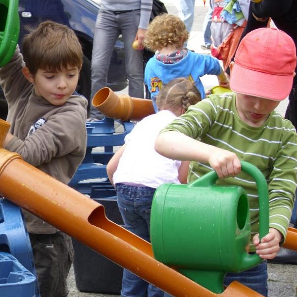 Für die Wasserbaustelle bringt der Spielefant alle Materialien mit: Getränkekisten und eine Plane für den Hauptpool, jede Menge aufgesägte Rohre und Verbindungsstücke, Handpumpen, Eimer und Gießkannen, kleine Plastikbälle, Korken und Schwimmtiere zum Spielen, sowie Kisten und Stative, um unterschiedliche Höhen einrichten zu können.